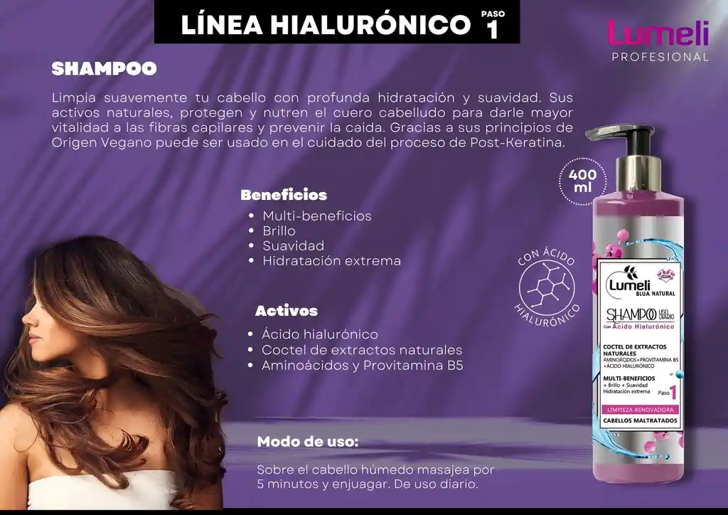 SHAMPOO Limpia suavemente tu cabello con profunda hidratación y suavidad. Sus activos naturales, protegen y nutren el cuero cabelludo para darle mayor vitalidad a las fibras capilares y prevenir la caída. Gracias a sus principios de Origen Vegano puede ser usado en el cuidado del proceso de Post-Keratina. Beneficios Multi-beneficios Brillo Suavidad Hidratación extrema TRATAMIENTO Gracias a sus activos naturales que aportan propiedades antioxidantes, de hidratación y regeneración sobre la fibra capilar, ayudan a neutralizar los daños causados por el medio ambiente. Gracias a sus principios de Origen Vegano puede usarse en el cuidado del proceso de Post-Keratina Beneficios Multi-beneficios Brillo Suavidad Hidratación extrema