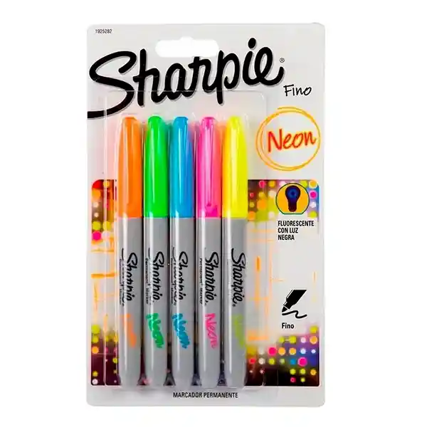 Sharpie Marcador Permanente Contiene 5 Unidades Neón Características: Iluminan Con Luz Oscura, Permanente en la Mayoría de Las Superficies, Gran Variedad de Colores, Tinta Que no se Decolora, Secado Rápido y es Resistente al Agua, Punta: Fina