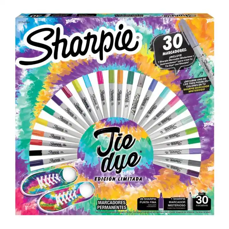 MARCADORES SHARPIE CAJA X 30 EDICION ESPECIAL INCLUYE: 30 Marcadores punta fina, de colores diferentes Tinta permanente de secado rápido Manual para realizar el Tie Dye