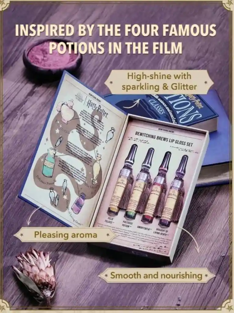 Sube de nivel tu juego de belleza (y tus habilidades para hacer pociones) con esta colección de brebajes fascinantes. Este libro de texto de nivel EXTASIS contiene cuatro magníficos brillos de labios en frascos de pociones inspirados en algunas de nuestras cervezas favoritas en Wizarding World™: Felix Felicis™, Polyjuice Potion™, Amortentia™ y Draft of Living Death™.