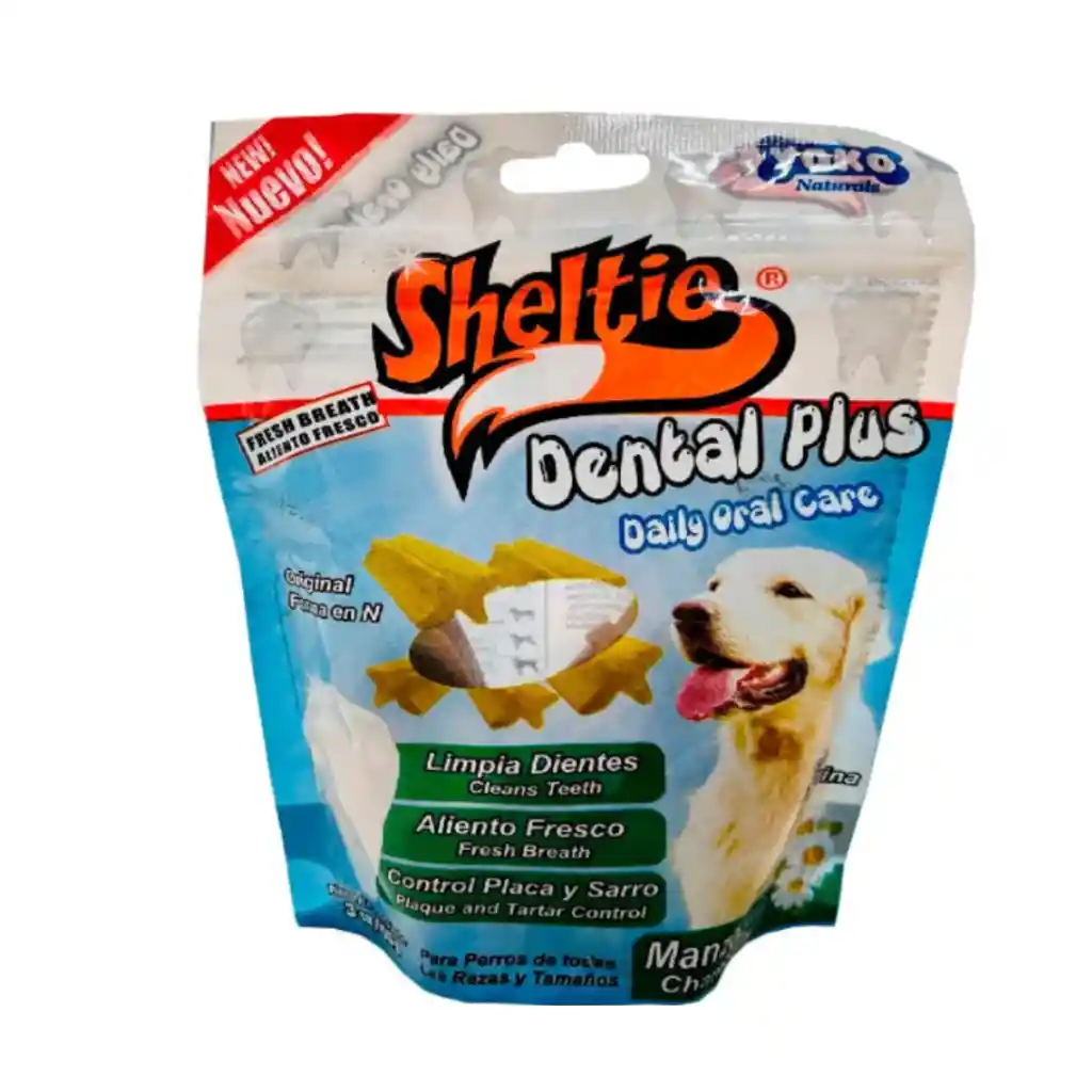 Sheltie Dental Plus Manzanilla Perro Sheltie Dental Plus Manzanilla es un snack funcional diseñado para el cuidado dental de los perros, que ayuda a reducir la formación de placa y sarro, y refresca el aliento. Contiene manzanilla por sus propiedades calmantes y antiinflamatorias, y taurina para un corazón saludable Salud Oral: Su textura especial y su forma en 'N' ayudan a limpiar los dientes y encías, y a remover la placa y el sarro. Ingredientes Naturales: Contiene manzanilla, conocida por sus efectos calmantes y antiinflamatorios en las encías, promoviendo la salud oral general. Beneficios Adicionales: El snack también incluye taurina, un aminoácido esencial que contribuye a un corazón saludable. Uso Diario: Puede ser administrado diariamente como un premio, facilitando la rutina de cuidado dental. PRESENTACIÓN: Bolsa 85gr