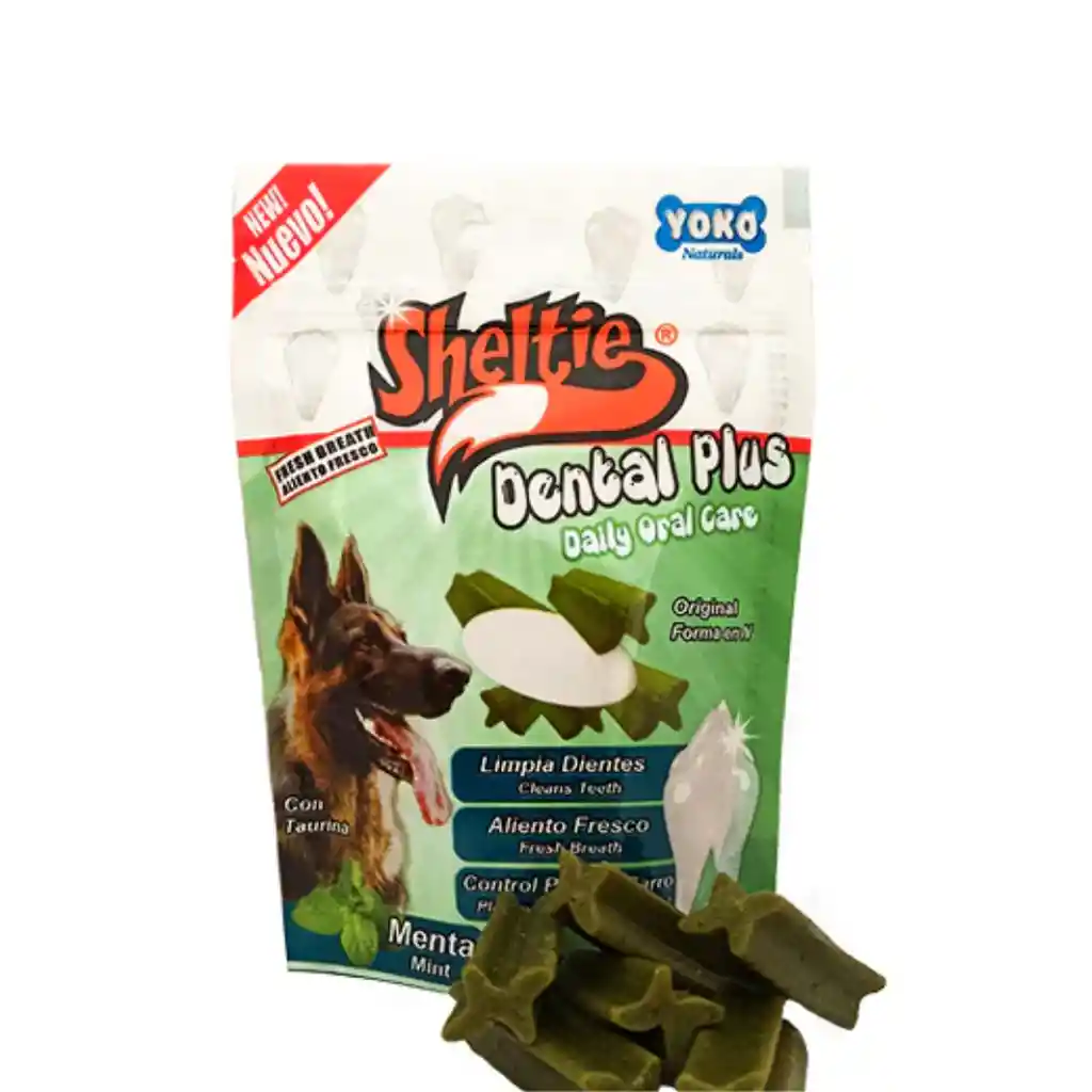 Sheltie Dental Plus Perro Sheltie Dental Plus es una línea de snacks funcionales para perros y gatos diseñada para ayudar a remover la placa y el sarro, además de refrescar el aliento Acción Dental: Su forma original en "N" y consistencia firme, pero no crujiente, está diseñada para introducirse entre los dientes y ayudar a la limpieza mecánica, reduciendo la acumulación de placa y sarro. Aliento Fresco: Contienen ingredientes naturales como menta que ayudan a combatir el mal aliento y proporcionan una sensación de frescura. Uso Diario: Se pueden ofrecer a diario como premio o después del cepillado, como complemento de una dieta balanceada y no como sustituto de un cepillado bucal profesional PRESENTACION: Bolsa 85gr