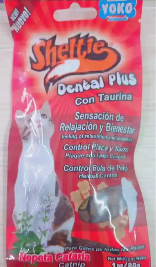 Los Sheltie dental plus Nepeta Catarina de YOKO NATURALS son un suplemento alimenticio que ayuda a remover la placa y el sarro de los dientes de tu gato, además contiene taurina para un corazón y vista saludable menta y romero natural que proporciona un alimento refrescante. Se puede suministrar a diario como premio ayudando así a cuidar la salud oral de tu gato