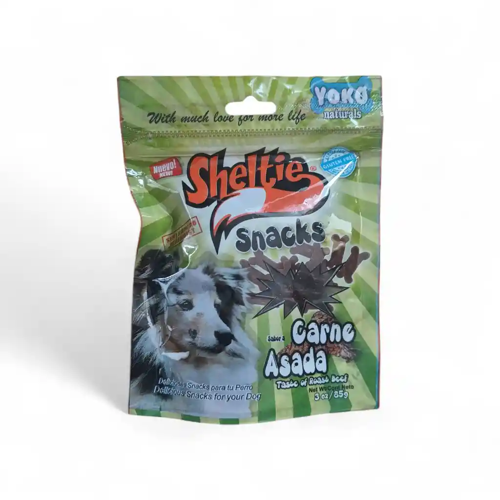 Sheltie Sticks sabor carne (también conocidas como Sheltie Snacks Carne Asada Son premios semihúmedos y fácilmente digeribles para perros, conocidos por su alta palatabilidad y sabor a carne asada. Están diseñadas para complementar la dieta diaria de un perro Sabor y Textura: El sabor a carne asada es muy apetecible para los perros, y su textura semihúmeda las hace fáciles de masticar, siendo adecuadas incluso para mascotas con dientes sensibles. Aporte Nutricional: Aportan proteínas esenciales para el desarrollo muscular y la energía diaria. Son descritas como bajas en grasa y libres de gluten. PRESENTACIÓN: Bolsa 85gr