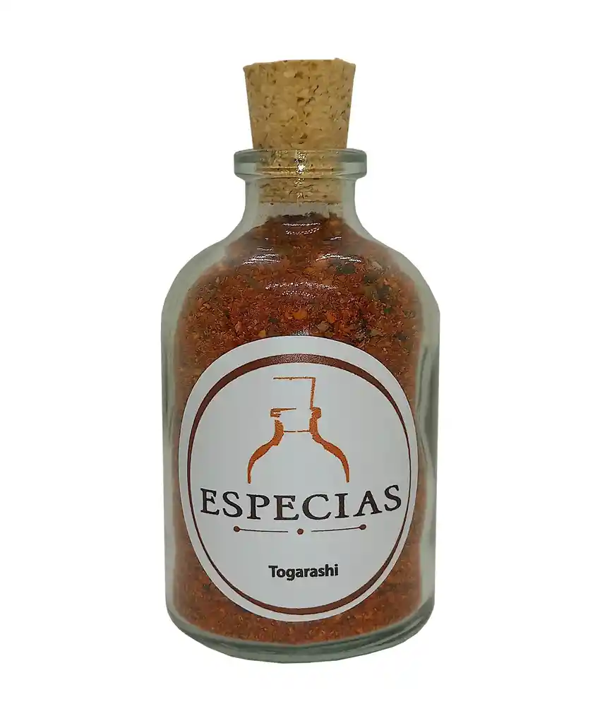 Shichimi Togarashi (Condimento originario de Japon) 35g (Chile, piel de mandarina tostada, semillas de amapola, pimienta Sichuan, semillas de ajonjolí, jengibre y nori) Aporta un sabor picante, dulce y cítrico. En Japón, de donde origina, se utiliza para sazonar y decorar platos ligeros, especialmente arroz. Es excelente para sazonar vegetales crudos para ensaladas, pescados blancos, carnes magras y huevos.