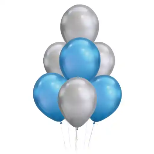 "Bouquet s de 7 globos en helio. Incluye: - 4 globos plateados en látex - 3 globos azul cromado en látex - Pesa sencilla Todos los globos contienen helio y gel de larga duración (3 días de duración). "