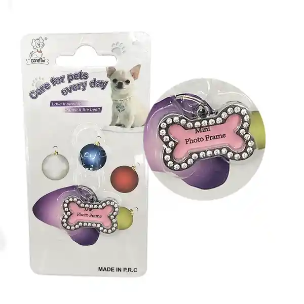 Placa Metálica Pequeña Para Mascotas en Forma de Hueso. Diseño Con Apliques Brillantes y Con Ranura Superior Para la Foto o Los Datos de la Mascota. Cuenta Con Argolla Metálica Para Colgar en el Collar. Características: Dimensiones: Alto: 2 cm x Largo: 3.5 cm x Ancho: 0.5 cm. Peso Aproximado: 6.5 g. Material: Metálico.