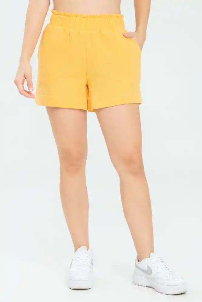 Short en tejido plano fondo entero, talle alto, elástico en pretina, bolsillos laterales, silueta semi ajustada, bolsa papel.