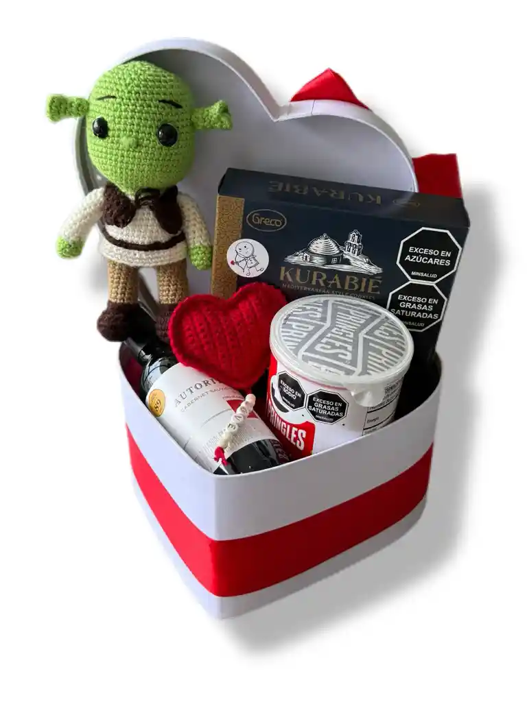 Contenido del detalle 1 peluche Shrek (18 cm de alto) tejido a mano 1 llavero en forma de corazón Tejido a mano 1 vino tinto Autoritas Cabernet Sauvignon (187 ml) 1 Cookies mediterranean Kurabie 1 Papas Pringles (37 g) 1 caja temática en forma de corazón. Incluye tarjeta.