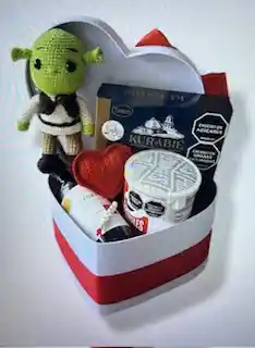 Contenido del detalle 1 peluche Shrek (18 cm de alto) tejido a mano 1 llavero en forma de corazón Tejido a mano 1 vino tinto Autoritas Cabernet Sauvignon (187 ml) 1 Cookies mediterranean Kurabie 1 Papas Pringles (37 g) 1 caja temática en forma de corazón. Incluye tarjeta