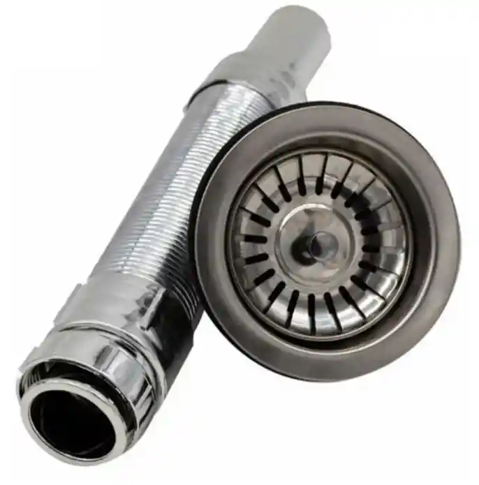 SIFÓN FLEXIBLE CROMADO PARA LAVAPLATOS CON CANASTILLA 4 PULGADAS Un producto de alta resistencia, te permite adaptarlo para cualquier tipo de lavaplatos, corregir errores en la instalación en caso de que el punto de agua residual quede corrido. Acabado: Cromado Sistema: Flexible Fácil instalación, sistema flexible y adaptable. Tipo: Desagüe Material: Desagüe Abs, Canastilla Acero Inoxidable. Dimensiones: - Canastilla 4 Pulgadas. - Desagüe: Alcanza un largo de 80cm.