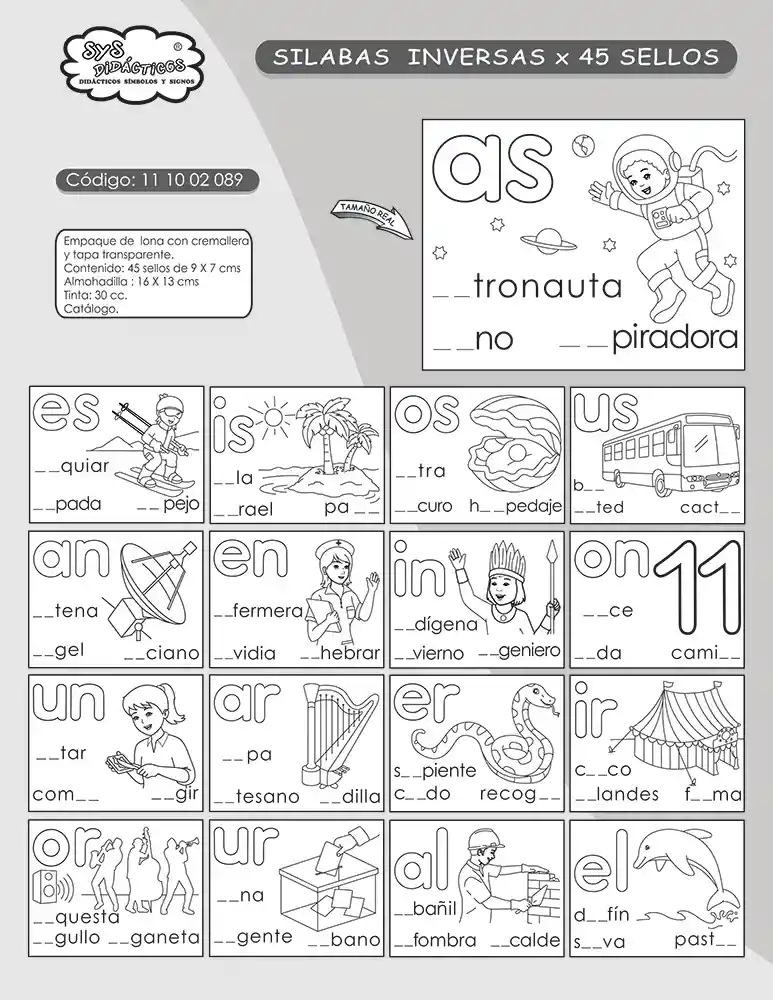 Empaque de lona con cremallera y tapa transparente Contiene: 45 sellos Tamaño: 9 x 7 cm Almohadilla : 16 x 13 cm Tinta: 20 cc.