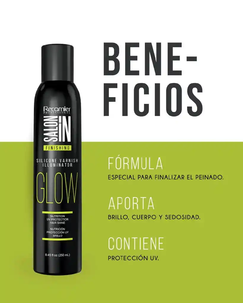 SILICONA EN SPRAY VARNISH ILLUMINATOR GLOW SALON IN 250 ML : Aporta brillo, cuerpo y sedosidad. Contiene protección UV. Aplique en el cabello seco como finalizador del peinado para obtener un brillo extremo o antes de iniciar el proceso de secado. Modo de uso Vaporice suave y uniformemente a 30 cm de distancia del peinado. Especificaciones Contiene protección UV.