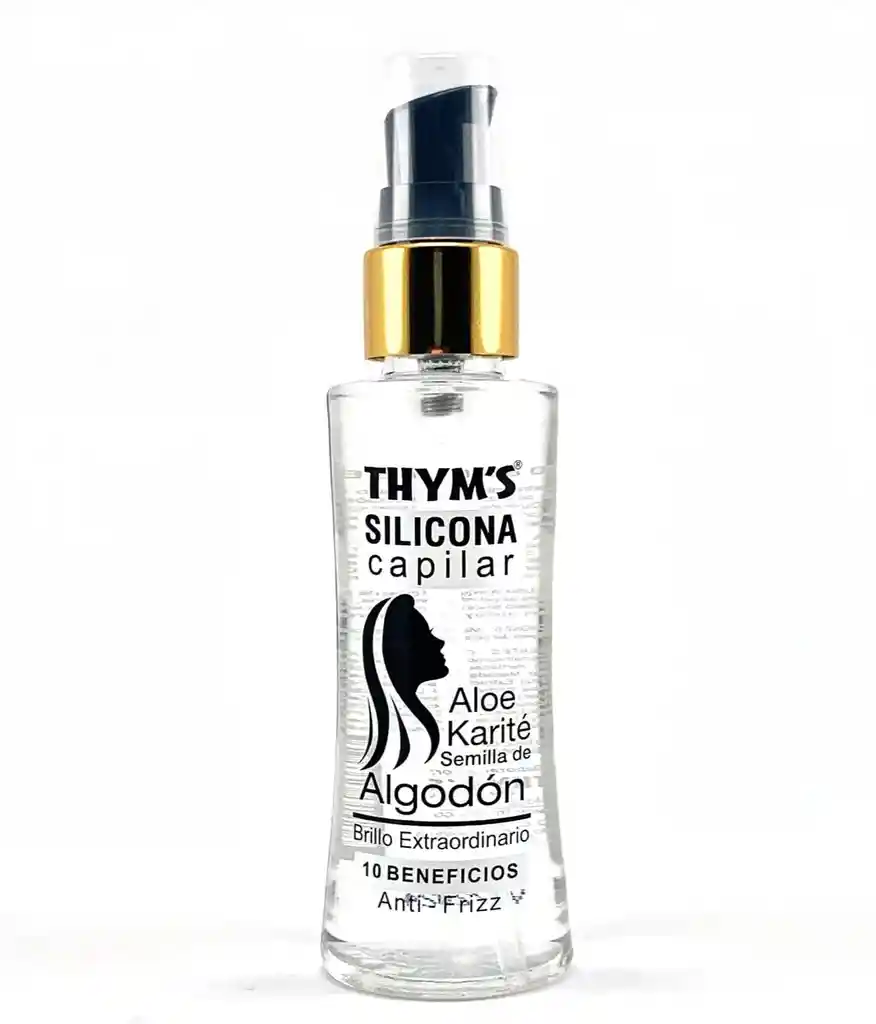SILICONA THYMS 60 ML : Es el producto ideal para darle brillo y suavidad al cabello. Reduce la carga estática eliminando el frizz y otorgando un excelente acabado después del cepillado y planchado Fórmula a base de siliconas que restauran y protegen la fibra capilar y facilitando así el peinado y creando una capa protectora contra el calor producido por planchas y secadores. THYM’S Silicona Capilar es un producto ideal que otorga un brillo extraordinario y extra suavidad al cabello. Sus exclusivos componentes naturales Aloe vera, Karité y Semilla de Algodón permiten un cabello más saludable, hidratado y no graso. ¿Qué hace? Controla el Frizz de manera inmediata y lo mantiene disciplina por más tiempo. 10 beneficios en 1 BENEFICIOS DE DESEMPEÑO 1.Brillo Extraordinario 2.Control de Frizz 3.Disciplinante 4.Acondicionamiento 5.Suavidad BENEFICIOS DE PROTECCION Y CUIDADO Sellado de puntas Nutrición Hidratación No grasosa Todo tipo de cabello.