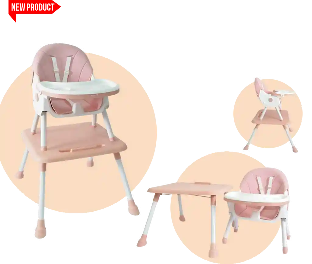 Estructura resistente y estable. Asiento acolchado, ergonómico y fácil de limpiar. Bandeja doble desmontable, con compartimentos para alimentos. Cinturón de seguridad de 5 puntos. Amplia canasta inferior. Patas antideslizantes. Llantas de movilidad se convierte en mesa