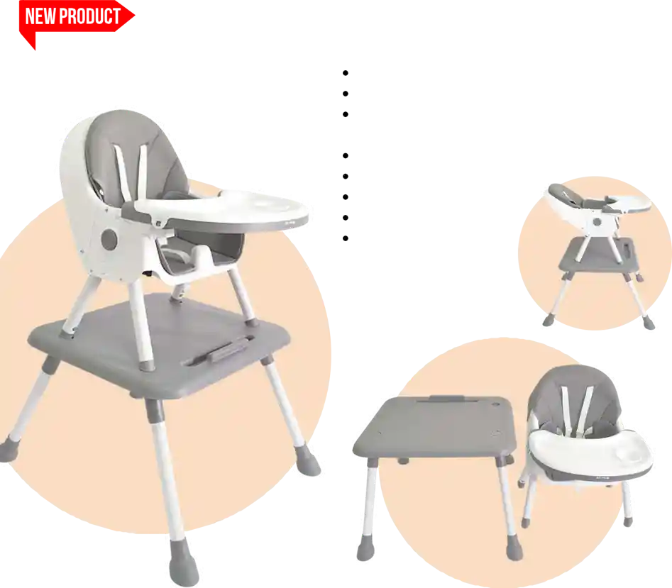 Estructura resistente y estable. Asiento acolchado, ergonómico y fácil de limpiar. Bandeja doble desmontable, con compartimentos para alimentos. Cinturón de seguridad de 5 puntos. Amplia canasta inferior. Patas antideslizantes. Llantas de movilidad se convierte en mesa