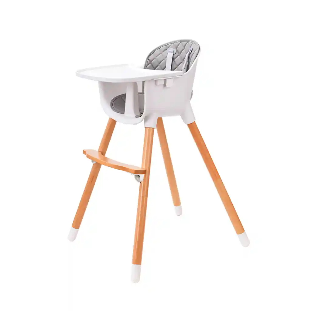 Silla Comedor con estéticas y resistentes patas en madera, que además cuenta con dos alturas, silla alta y silla baja, apto para edades de 6 meses a 36 meses cuenta con cinturón de seguridad y doble bandeja extraíble. Características: Es regulable – Cuenta con dos alturas diferentes y posiciones de acercamiento de bandeja para ajustarla a las necesidades del bebé El reposapiés es extraíble Muy fácil de lavar por la bandeja extraíble y la tela del asiento Está disponible en gris, rosa y celeste. Está dotada con un arnés de 5 puntos y tapones antideslizantes en la parte inferior de las patas. Su montaje es rápido y sencillo.