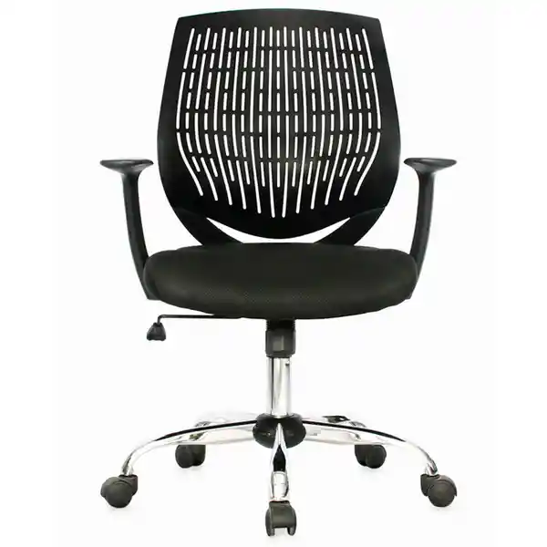 Base Cromo/Brazo fijo/mecanismo basculante/espalda en plástico de color negro, y asiento en paño negro/graduación de altura en asiento/ajuste en recueste de silla cuando no esta en posición fija