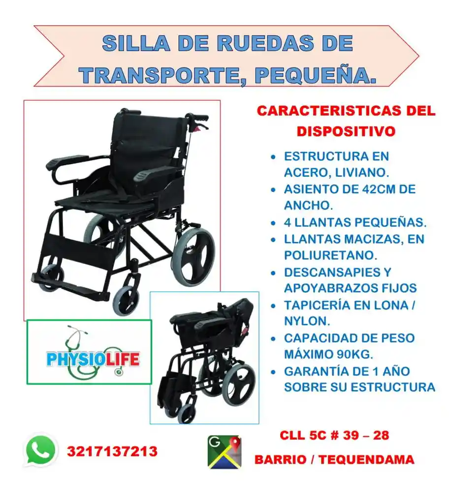 Silla de Ruedas de Transporte En Acero, para quienes necesitan que los lleven de un lugar a otro de forma segura y fácil. Marco plegable en acero pintado Llantas maciza con rin estrella Apoyabrazos fijos Reposapiés fijos Banda para sujeción de piernas Respaldo abatible Freno activado por el cuidador Tapicería en lona Recomendada para usos interiores y exteriores. Material Acero pintado. Peso neto 12,5 kg. Capacidad de peso 75 kg. Llanta Trasera Rin estrella 12″ poliuretano grabado color negro. Altura de los reposapiés 41-36 cm. Altura del apoyabrazos 20 cm. Altura del asiento al piso 45 cm. Altura del respaldo 43,5 cm. Ancho del asiento 41,5 cm. Ancho total de la silla 58 cm. Profundidad del asiento 36 cm.