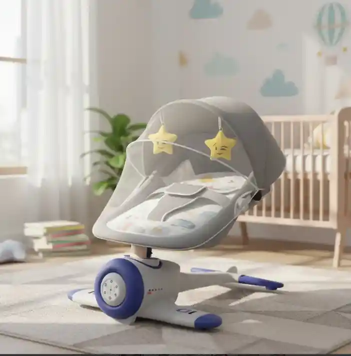 Silla Mecedora Eléctrica para Bebé con Movimiento Lateral Aspecto único: Su base en forma de avión le da un diseño innovador, llamativo, estable y muy resistente. Diseño multifuncional: Cuenta con 4 rangos de oscilación (10°, 16°, 20° y 25°) para mayor comodidad de tu bebé. Incluye 4 funciones de temporizador (10, 20, 30 y 40 minutos) y respaldo ajustable en 3 posiciones. Montaje rápido y ligero: Fácil de armar y desmontar. Con un peso de solo 5 kg (11 lb), es práctica para mover dentro del hogar. Cojines extraíbles y lavables: Fabricados en fibra de poliéster con textura suave. Incluye almohadas ajustables que se adaptan a la altura del bebé. Mosquitera desmontable: Protege al bebé de picaduras de mosquitos, mientras le permite observar el mundo exterior cómodamente.
