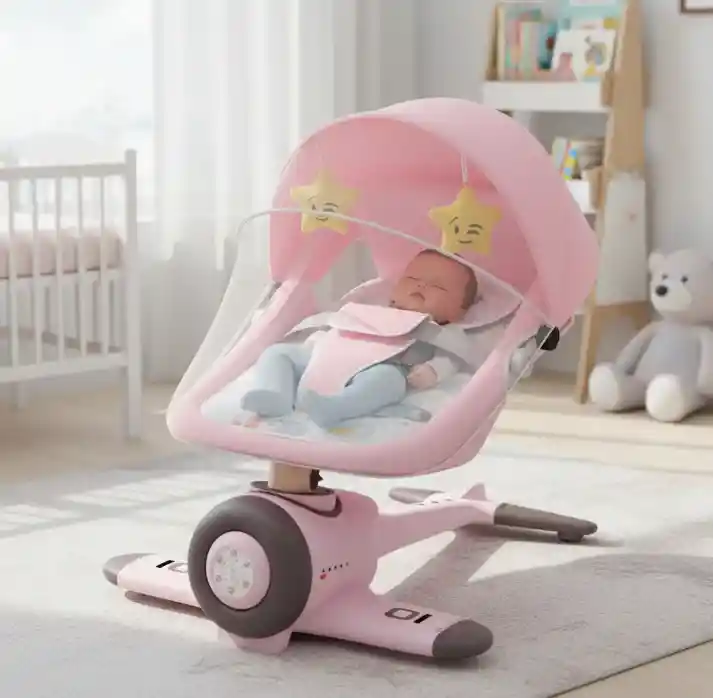 Silla Mecedora Eléctrica para Bebé con Movimiento Lateral Aspecto único: Su base en forma de avión le da un diseño innovador, llamativo, estable y muy resistente. Diseño multifuncional: Cuenta con 4 rangos de oscilación (10°, 16°, 20° y 25°) para mayor comodidad de tu bebé. Incluye 4 funciones de temporizador (10, 20, 30 y 40 minutos) y respaldo ajustable en 3 posiciones. Montaje rápido y ligero: Fácil de armar y desmontar. Con un peso de solo 5 kg (11 lb), es práctica para mover dentro del hogar. Cojines extraíbles y lavables: Fabricados en fibra de poliéster con textura suave. Incluye almohadas ajustables que se adaptan a la altura del bebé. Mosquitera desmontable: Protege al bebé de picaduras de mosquitos, mientras le permite observar el mundo exterior cómodamente.