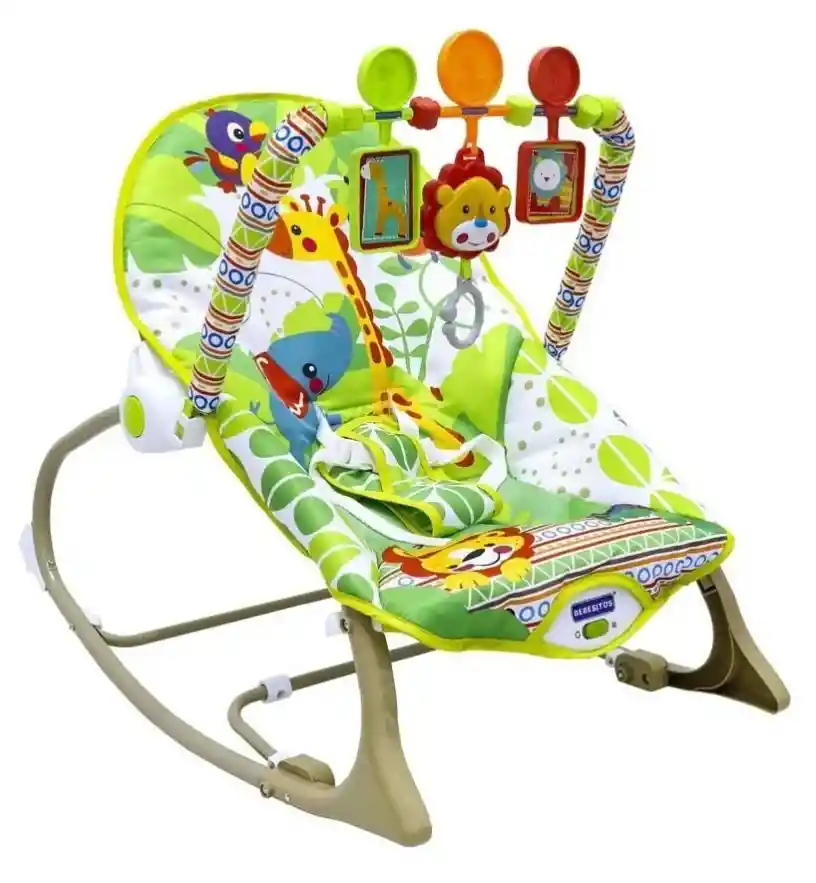 Silla Mecedora Vibradora Musical Bebesitos® • Amplio tiempo de uso: 0 meses a 4 años (18 Kg.) • Doble servicios (Vibradora y mecedora.) • Toldillo. • Estimulación sensorial: juguetes, sonidos. • Anti reflujo. • Pie de apoyo replegable para pasar de modo fijo a mecedora. • Arnés de seguridad de tres puntos. • Barra de juguetes móviles y musical desmontable. • Tela removible para su lavado en máquina. • Medidas armado: alto 49, ancho 46 y fondo 65 Cm. • Requiere 1 pilas D (no incluida).