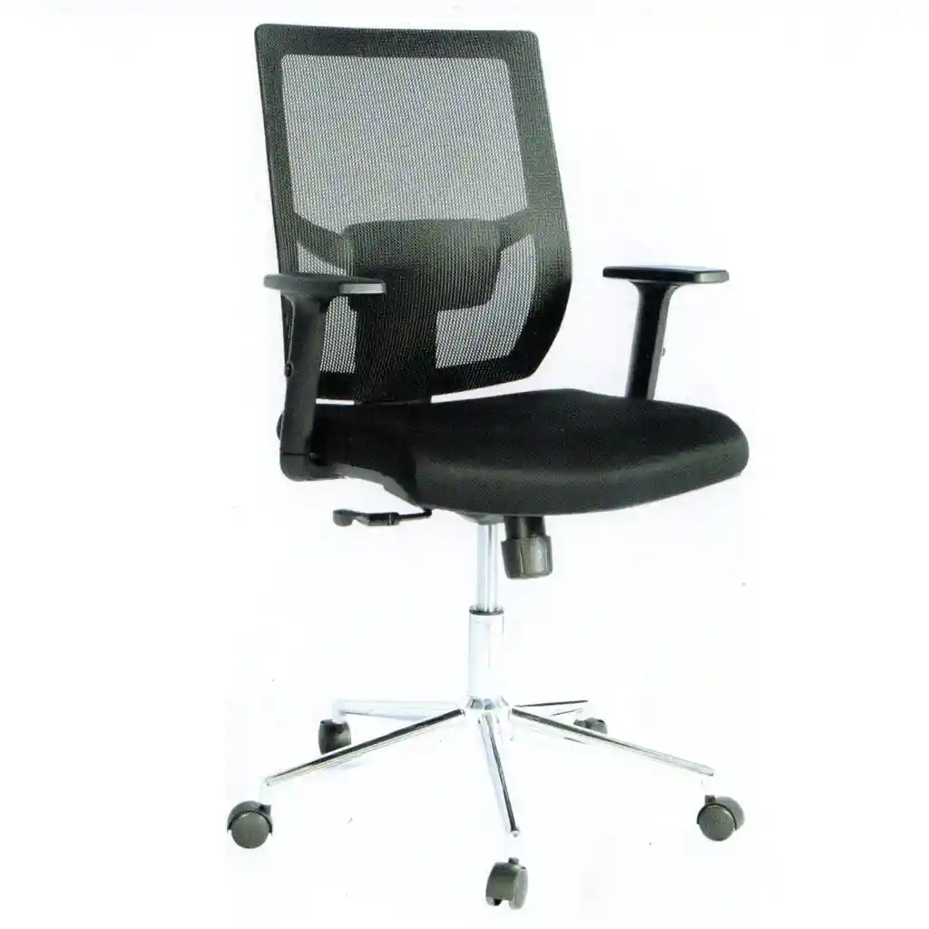 -Espalda: Material: Tela micro perforada tipo malla. Marco en polipropileno negro Dimensiones: 47 cm de ancho x 53 cm de alto. Ajustable en Altura -Asiento: Material: Tela micro perforada tipo malla. Componentes: Parte interna en madera (triplex 12 mm) Espuma: Poliuretano. Espesor: 50 mm Dimensiones: 47 cm de ancho x 49 cm de profundidad - Brazos: Ajustables en altura en polipropileno color negro - Mecanismo: Movimiento basculante en espalda cuando no está en posición fija -Cilindro Neumático: Ajuste de altura del asiento con elevación de gas. Material: Acero. Color: Negro -Estrella de 5 aspas en Acero cromado. Diámetro: 600 mm. Material: Nyllon. Calidad Bifma. -Rodachinas doble carrete. Material: Nylon Calidad Bifma, Color Negro. Diámetro: 50 mm -Garantía: 1 año por defecto de fábrica. Resistencia máxima de peso: 100 kg