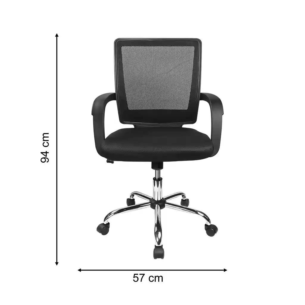 Silla secretarial brazos en polipropileno, espaldar en malla , asiento tapizado en paño negro microperforado, estrella metálica cromada cinco aspas con rodachinas en nylon. MEDIDAS : ALTO 94 / ANCHO 57 / FONDO 47