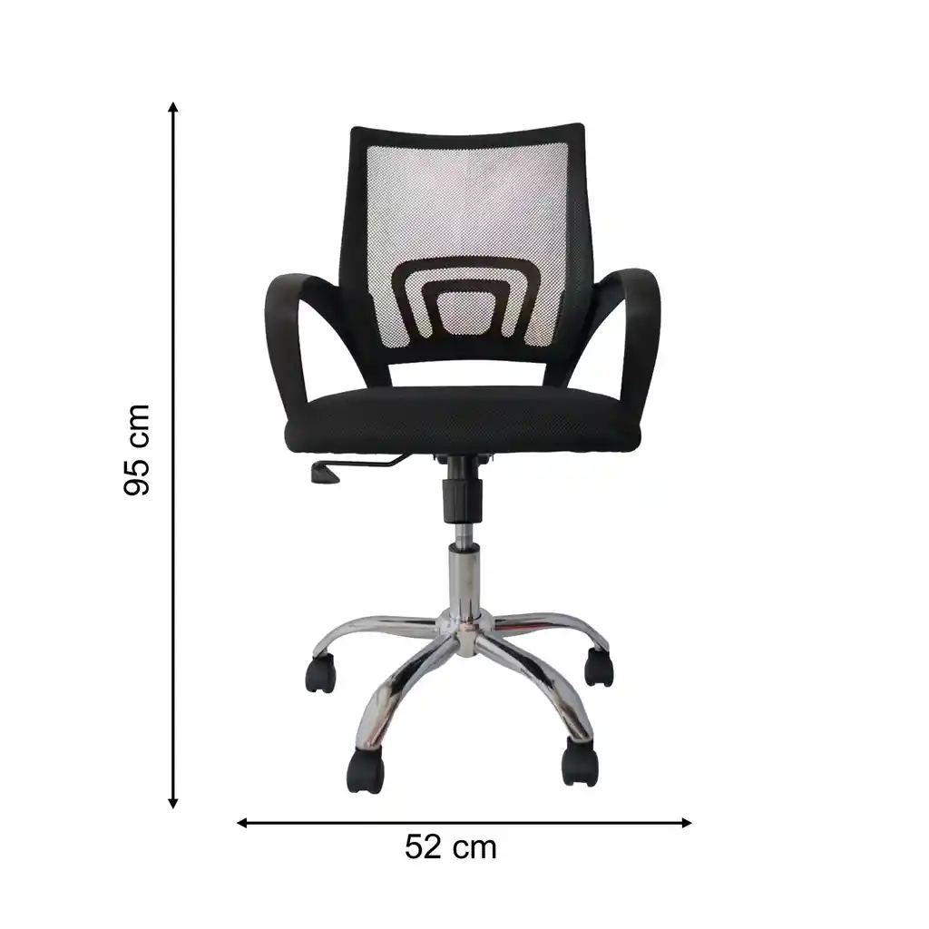Silla secretarial con asiento Tapizado en paño de alto trafico microperforado , espaldar en malla con soporte lumbar con marco y brazos fijos en polipropileno , estrella de cinco aspas metálicas y rodachinas en nylon. MEDIDAS: ALTO 95 / ANCHO 52 FONDO 44