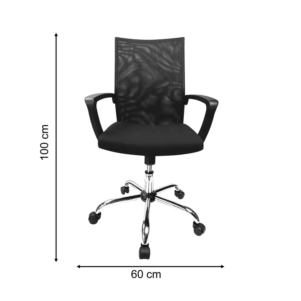 Silla secretarial con asiento Tapizado en paño de alto trafico , espaldar ergonómico en malla y brazos fijos en polipropileno , estrella de cinco aspas metálicas y rodachinas en nylon MEDIDAS : ALTO 100 / ANCHO 60 / FONDO 44 GARANTIA DE 24 MESES