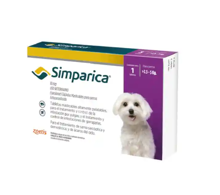 Simparica 10 mg es un antiparasitario externo oral para perros de 2.5 a 5 kg de peso, que elimina pulgas, garrapatas y ácaros (causantes de sarna). Su principio activo, sarolaner, ofrece una acción rápida y persistente durante al menos 35 días (más de un mes), siendo una tableta masticable muy palatable