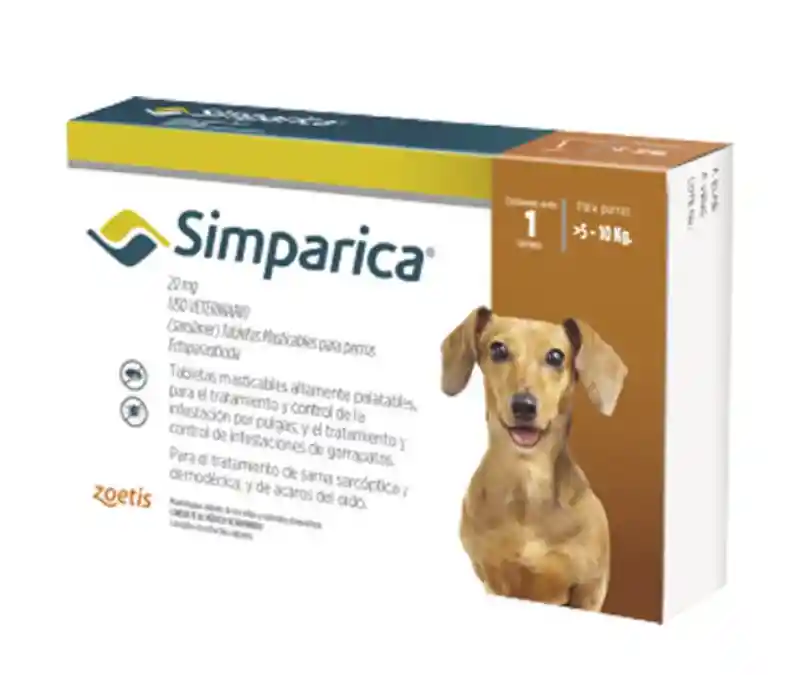 Simparica 20 mg es un antiparasitario externo oral para perros de 5-10kg de peso, que elimina pulgas, garrapatas y ácaros (causantes de sarna). Su principio activo, sarolaner, ofrece una acción rápida y persistente durante al menos 35 días (más de un mes), siendo una tableta masticable muy palatable