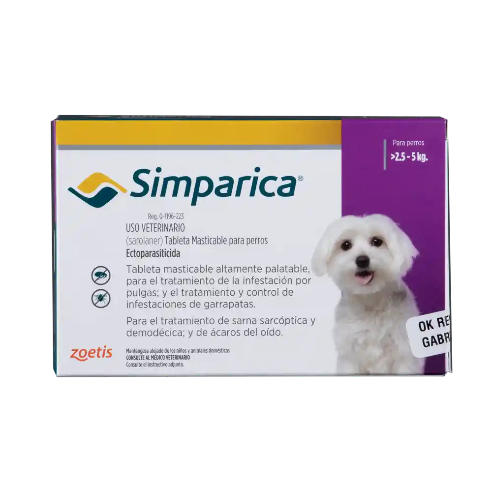 Simparica es un medicamento antiparasitario para perros que contiene sarolaner como ingrediente activo. Se presenta en forma de tabletas masticables, lo que facilita su administración. Simparica es eficaz contra pulgas, garrapatas y ácaros, proporcionando protección durante un mes con una sola dosis. Es especialmente útil en el tratamiento de la dermatitis alérgica por picadura de pulga (DAPP) y otras infestaciones parasitarias.