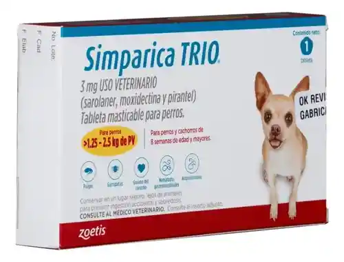 Simparica Trio para perros de 1,25 a 2,5 kg. Tableta masticable mensual contra pulgas, garrapatas y parásitos internos. Formulado para cachorros y perros muy pequeños.