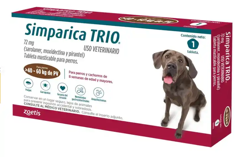 Antiparasitario interno y externo para perros que se administra por via oral una vez al mes y está formulado para el tratamiento y control de infestaciones de pulgas, garrapatas, acaros y parasitos gastrointestinales. Beneficios Acción