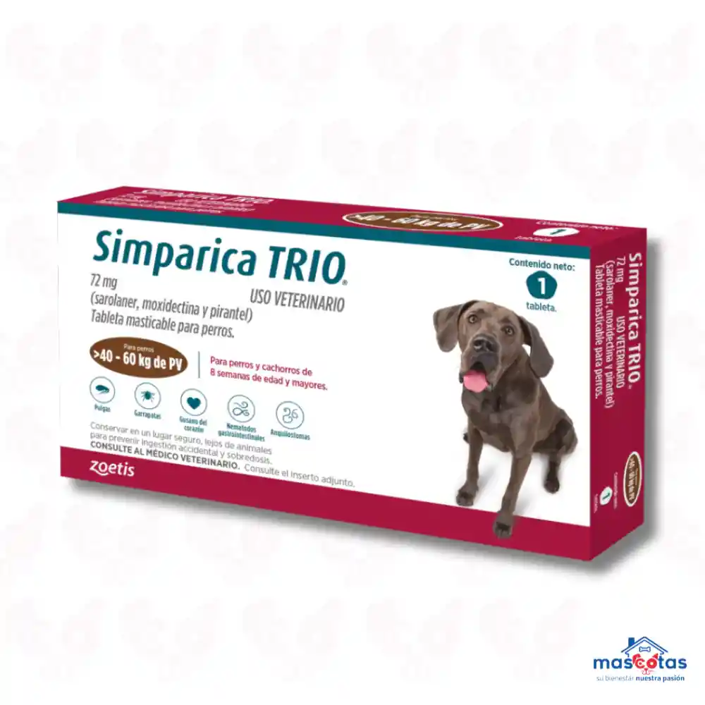 Simparica Trio es un antiparasitario oral mensual para perros que combina protección de amplio espectro contra parásitos externos (pulgas y garrapatas) e internos (gusano del corazón, ascárides y anquilostomas), ofreciendo una solución conveniente y sabrosa para la salud integral de la mascota en una sola tableta masticable. Se administra mensualmente y es efectivo desde el primer día, protegiendo contra varias infestaciones y ayudando a controlar la dermatitis alérgica por picadura de pulga (DAPP) ¿Qué protege? Parásitos Externos: Pulgas (adultas) y varias especies de garrapatas (garrapata estrella solitaria, de la Costa del Golfo, americana del perro, de patas negras, marrón del perro). Parásitos Internos: Gusano del corazón (previene la enfermedad), lombrices intestinales (ascáridos) y anquilostomas (adultos y larvas inmaduras). Componentes Activos: Sarolaner: Elimina pulgas y garrapatas. Moxidectina: Previene la enfermedad del gusano del corazón. Pirantel: Combate parásitos gastrointestinales como ascáridos y anquilostomas. Beneficios Clave: Protección Completa: Un solo producto para múltiples parásitos. Fácil Administración: Tableta masticable, sabrosa y se puede dar con o sin alimento. Acción Rápida y Duradera: Actúa rápidamente y ofrece protección mensual. Seguro: Aprobado para cachorros a partir de las 8 semanas de edad y se puede usar en un plan de control de DAPP. Importante: Es un medicamento de prescripción veterinaria; un médico veterinario debe confirmar su necesidad y la dosis adecuada. No es necesario administrarlo junto con comida