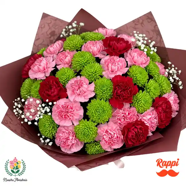 Claveles rosas: 7 tallos Claveles rojos: 5 tallos Crisantemos verdes: 5 tallos Flores blancas pequeñas: 3 tallos