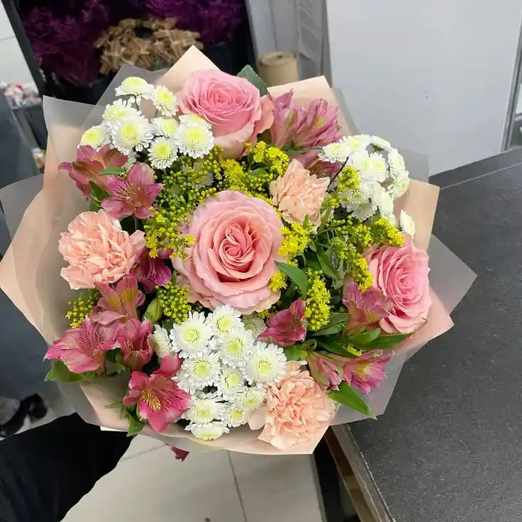 Rosas rosadas, coquetas blancas, claveles y astromelias se entrelazan en un bouquet que canta al amor con delicadeza y armonía, despertando sentimientos suaves y eternos.