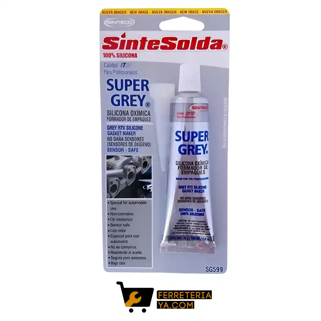 SILICONA SUPER GREY SINTESOLDA X 50 ML Formador de empaques. • Segura para sensores. • Bajo olor. • Resistente al aceite. • No es corrosiva. • Color gris. Producto ideal para usarse en el sector automotriz en la tapa de termostato, cárter del aceite, bombas de agua, cajas de cambios, tapas de válvulas, cajas con conexiones eléctricas, área del motor. La SILICONA SUPER GREY es una silicona de un solo componente, que vulcaniza a temperatura ambiente, diseñada para elaborar empaques confiables del tipo “formado en el lugar”, en ensambles mecánicos. Es una pasta que no escurre y por acción de la humedad ambiente genera SILICONA SUPER GREY un elastómero resistente y elástico. La silicona resiste el envejecimiento, la intemperie y los cambios térmicos sin que se presente endurecimiento, encogimiento, reducción del volumen o agrietamiento. Está diseñada para soportar una alta resistencia a los aceites, buena SILICONA SUPER GREY adhesión y flexibilidad. La tiene características especiales como: No corrosiva, Bajo olor, Reemplaza muchos empaques, No inflamable, No tóxica, Alta resistencia al aceite.