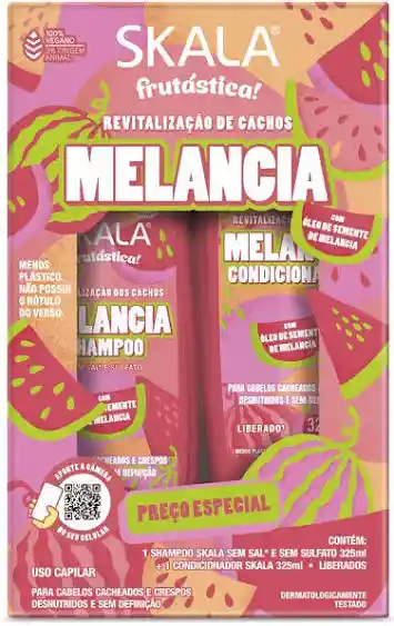 Skala Melancia es una línea de productos capilares de la marca Skala con extracto de sandía, aceite de argán y vitaminas A y C, diseñada para hidratar, nutrir y definir cabellos crespos y rizados. Se puede usar como tratamiento, acondicionador o crema para peinar y promete una ultra definición por 72 horas. La fórmula es vegana, libre de parabenos, siliconas, vaselina y aceite mineral, y está dermatológicamente probada.