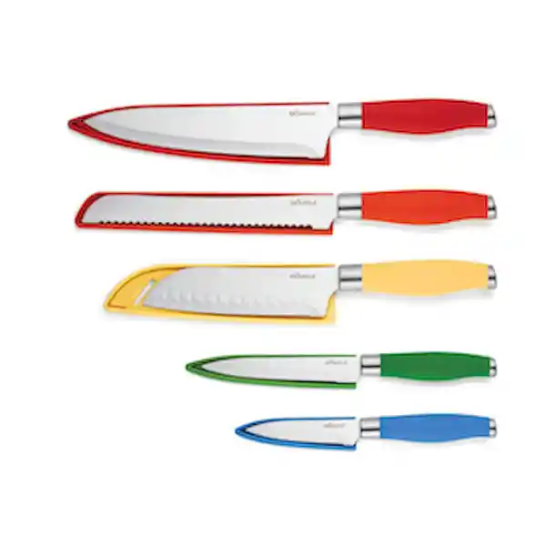 Set Contiene 5 Unidades. Ofrece Una Selección Cuidadosamente Diseñada Para Satisfacer Todas Las Necesidades en la Cocina. Este Conjunto Incluye un Cuchillo Chef un Cuchillo Para Pan un Cuchillo Utilitario un Cuchillo Santoky y un Cuchillo Pelador Cada Uno Con Características Específicas Que Los Hacen Indispensables Para Diferentes Tareas Culinarias. El Cuchillo Chef Con su Hoja Ancha y Afilada es Ideal Para Cortar Picar y Rebanar Una Amplia Variedad de Alimentos Brindando Precisión y Control en Cada Movimiento..