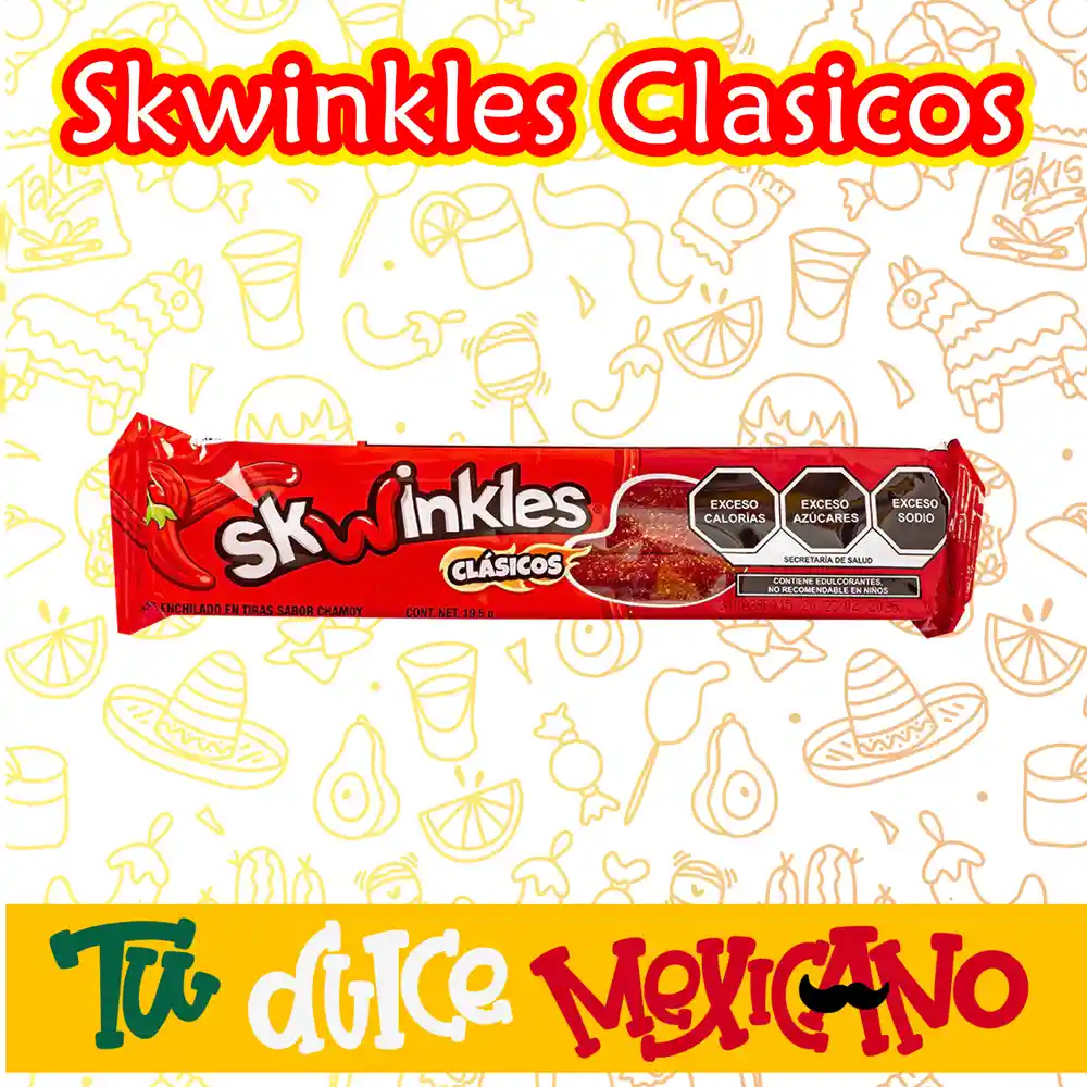 Los Skwinkles Clásicos son tiras de dulce suave y masticable con sabor a mango y chamoy, caracterizados por ser "enchilados" (con chile y un toque ácido). Tienen una forma peculiar similar a espagueti, cubiertos de polvo de chile, creando una combinación dulce, salada y picante