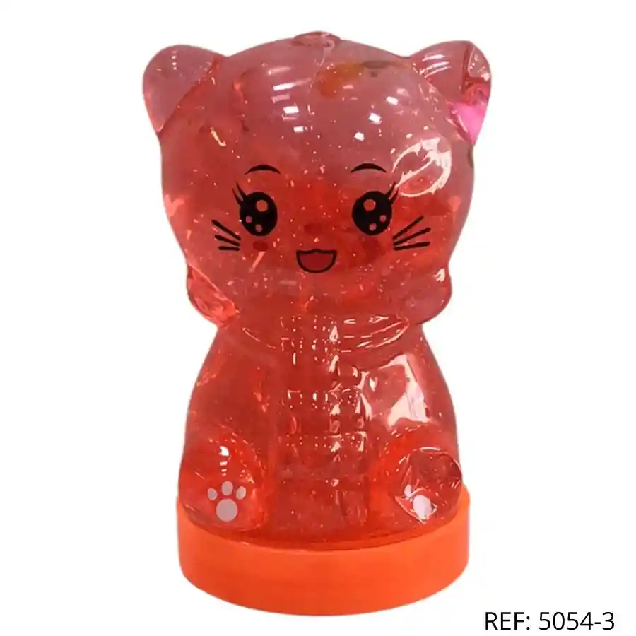 Slime naranja con textura suave y brillante. Gatito tierno que fascina a niños y grandes.