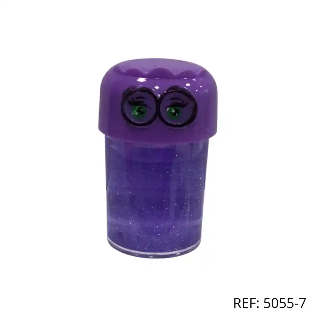 Slime morado brillante con expresión divertida. ¡Estira, aprieta y colecciona!