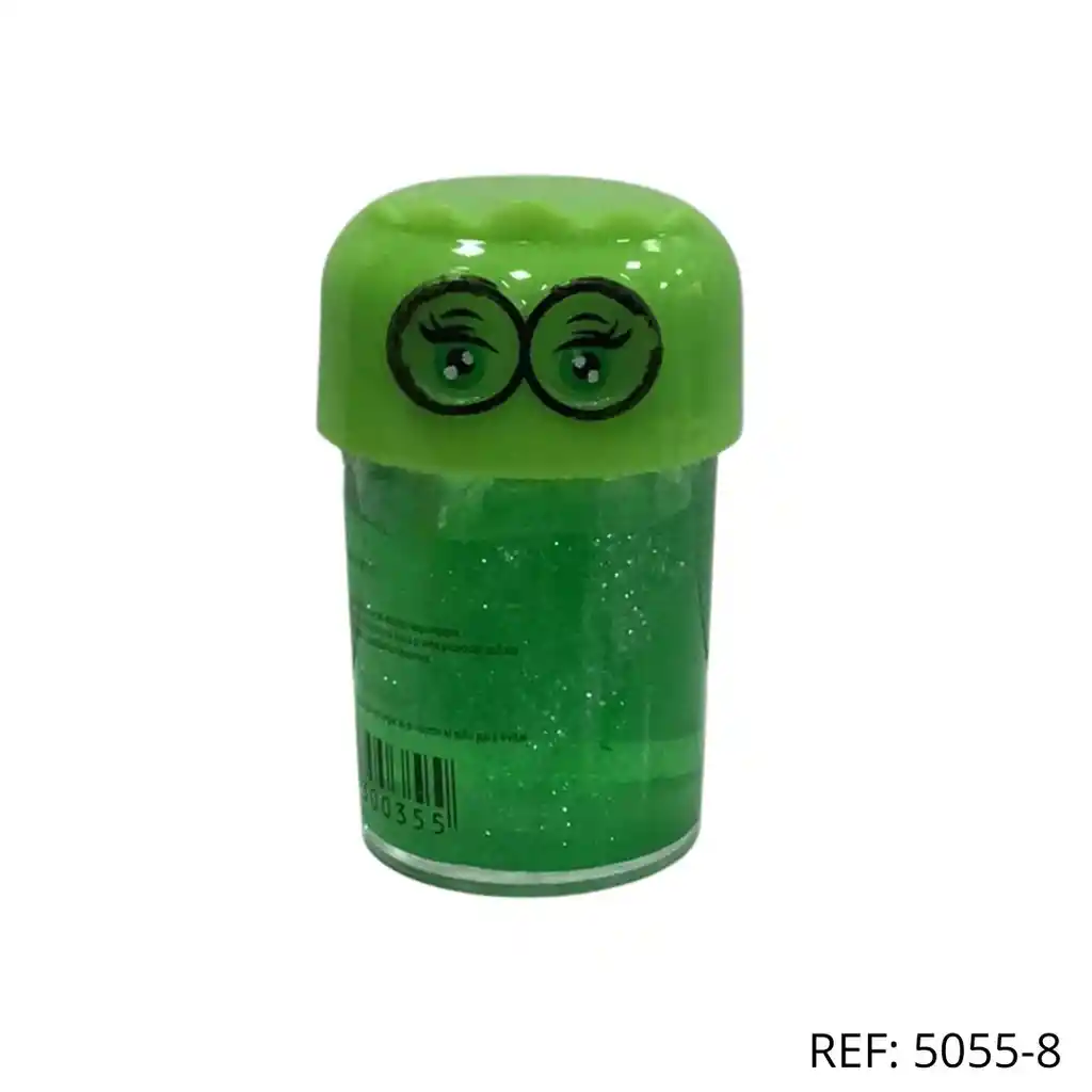 Slime verde con purpurina y tapa con ojos tiernos. ¡Diversión en cada apretón!