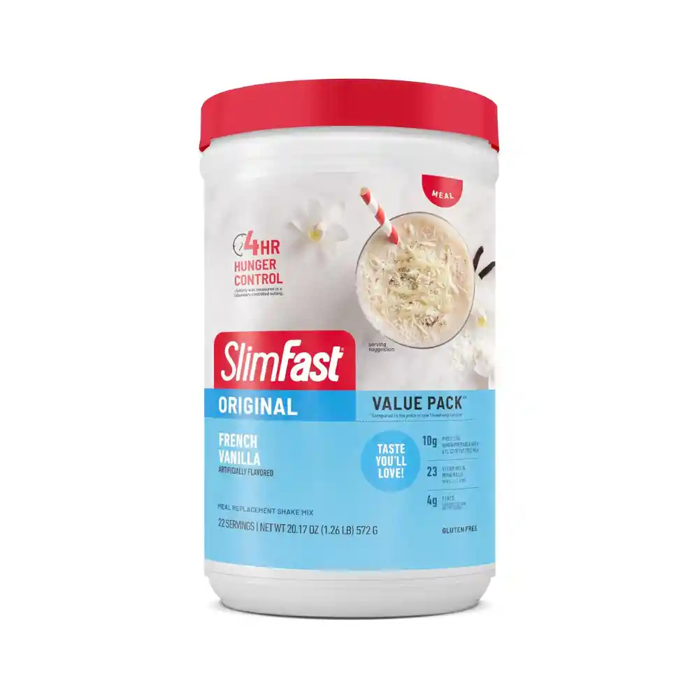 SlimFast Tiene un nuevo look! El embalaje puede variar de las imágenes en el sitio, pero el producto en el interior sigue siendo el mismo Un sabor que te encantará - Sabor dulce y cremoso de vainilla francesa Creado pensando en tu nutrición proporcionando 24 vitaminas y minerales como A, C, D, E y zinc Cada delicioso batido proporciona hasta cuatro horas de control del hambre para mantenerte en el camino Cada mezcla de batido original de SlimFast proporciona 0.35 oz de proteína y 0.14 oz de fibra *No es un alimento bajo en calorías. Consulte Información nutricional para obtener contenido de grasas saturadas.