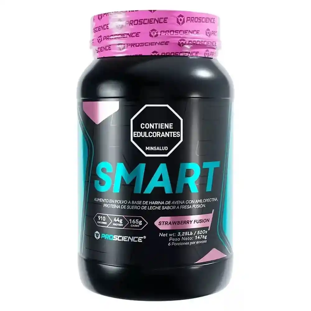 Ingredientes: Harina de Avena, Palatinosa, Amilopectina, Proteína de Suero de Leche, Caseina de Leche, Sabor Idéntico al Natural, Carboximetilcelulosa CMC (Estabilizante), Lecitina de Soya ( Estabilizante),Goma Xanthan (Espesante), Edulcorante Natural (Stevia), Dióxido de Silicio (Anticompactante) (1000 mg/Kg), Omega 3, Vitamina C (Ácido Ascórbico), Lactasa en polvo, Citrato de Zinc, Vitamina B6 (Piridoxina), Vitamina B1 (Tiamina), Vitamina D3. Presentación comercial: Envase y Liners interno de seguridad. Material del empaque: Envase plástico. Método de conservación: Almacenar bien cerrado en su empaque original, en un lugar fresco a temperatura inferior a 30 °C y humedad relativa inferior a 75%. No introducir elementos húmedos, después de abierto consumase en el menor tiempo posible. Contenido: Neto 3,25 Lb / 52 Oz. Servicios: 6 por envase Sabor: Gourmet Vainilla/ Coconut /Gourmet Chocolate/ Fusion Stawberry. Modo o método de consumo o preparación: Mezclar 6 cucharas (246g) del producto en 700 ml de agua, agitar hasta tener un producto homogéneo: Consumase una vez preparado. ¿Cómo tomar Smart ? Cada servicio de Smart de Pro Science son 6 scoops o medidores. Se puede dividir cada servicio en 2, es decir 2 tomas de 3 scoops en el día. 3 scoops después de realizar actividad física (el momento más importante) y 3 scoops entre comidas. Se puede tomar en agua o en leche para aumentar las calorías. Formato de Venta: Polvo. Registro Sanitario: RSA:0021601-2022