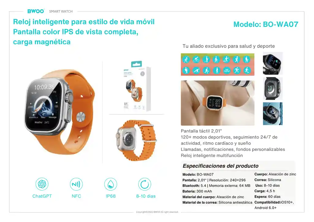 COMPATIBILIDAD: APPLE Y ANDROID NOTIFICACIONES: SI RESPONDER LLAMADAS: SI BATERIA: 8-10 DIAS MODO DEPORTE: SI RESISTENCIA: IP68 PANTALLA: IPS