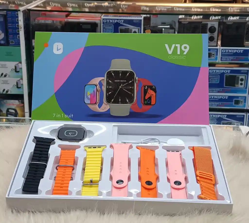 Notificación y vista de mensaje Realizar llamada Distancia, Calorías, Alarma Presión sanguínea Despertador Monitor de sueño Iluminación de la pantalla. Automático INCLUYE: 7 correas de repuestos 1 Cargador inalámbrico