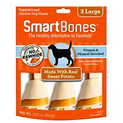 Con 3 Unidades. Smartbones® Tiene Todos Los Beneficios de un Masticable de Cuero Crudo… ¡Sin El Cuero Crudo! Sin Cuero Crudo Smartbones® Están Hechos Con Patatas Dulces Reales; Pollo y Otras Verduras Saludables Para un Sabor Delicioso Que Los Perros no Pueden Resistir.